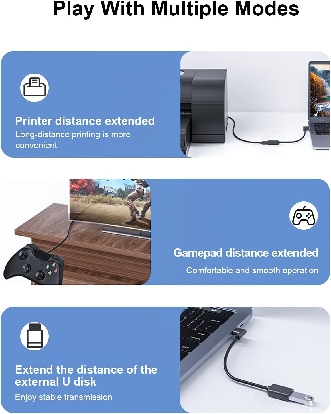 The female end supports various USB peripherals, including flash drives, keyboards, mice, cameras, speakers, chargers, and gaming accessories. Fully compatible with USB 2.0 standards and backward compatible with USB 1.1, this extension cord is a reliable connectivity solution for both work and entertainment.
