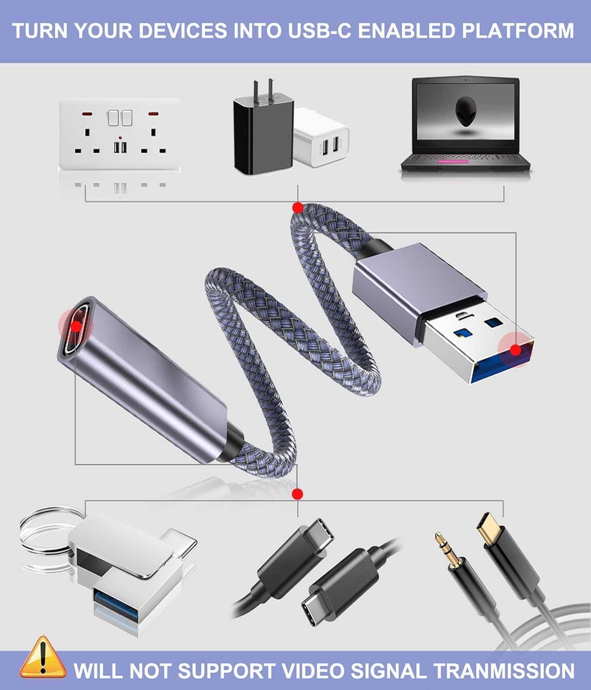 This USB-C Female to USB 3.1 Male Adapter Cable is built for fast and flexible connectivity. Featuring a durable aluminum alloy housing and premium nylon-braided cable, it resists wear, fraying, and tangling, ensuring long-term performance. With a length of 8.8 inches (approx. 22cm), it’s compact, portable, and ideal for desktop use, travel, or in-car charging.